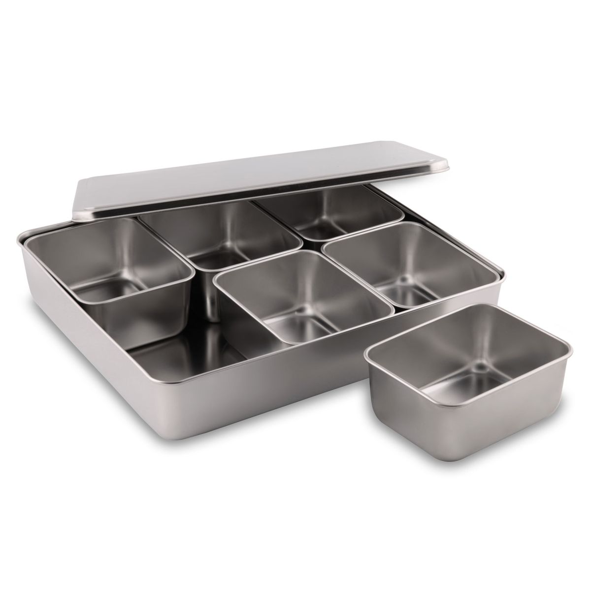 Контейнеры для специй Якуми — красивый и легкий способ навести порядок на кухне. Вам больше не придется загромождать кухню, путаясь в горах пластиковых чашек, горшочков и прочих емкостей! Используйте индивидуальные контейнеры из нержавеющей стали — удобные и взаимозаменяемые. Скоропортящиеся ингредиенты вы можете охлаждать, положив на дно секции кусочки льда, а тёплые — чтобы не остыли, подогревать на водяной бане. В комплект поставки также входит крышка, благодаря чему контейнер легко помещается в холодильник и все необходимые ингредиенты, таким образом, хранятся в одном месте.